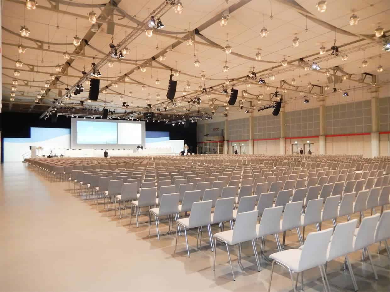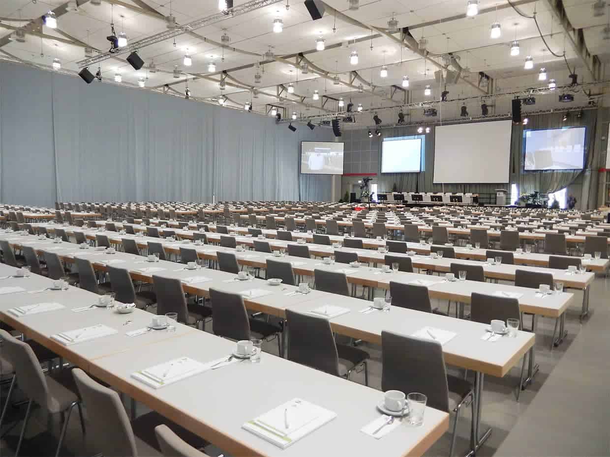 Klassische Tagungen, Konferenzen und Hauptversammlungen erhalten in unserer Eilenriedehalle den passenden Rahmen. Auf 3.476 m² Veranstaltungsfläche finden 1.930 Personen in parlamentarischer Bestuhlung und bis zu 4.034 Personen in Stuhlreihen Platz. Auf Wunsch kann die Veranstaltungsfläche mit einem Vorhang in verschiedene Bereiche unterteilt werden und so neben dem Plenum beispielsweise noch eine Cateringfläche für Kaffeepausen und Lunchbuffet geschaffen werden.